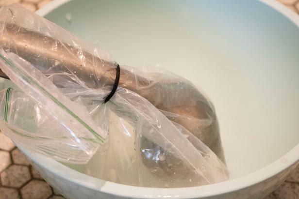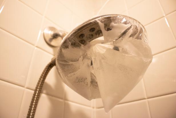 A zip tie is a very secure way to attach the bag around the neck of your showerhead. You can also use a rubber band if you’re able to wrap it well and keep the bag in place. Be mindful of the bag’s weight, too; if you have a small showerhead, you may want to reduce the amount of cleaner weighing down your fixture. (Just pour any excess onto the floor of the bathtub or shower and give the area a good washing while you’re at it.)