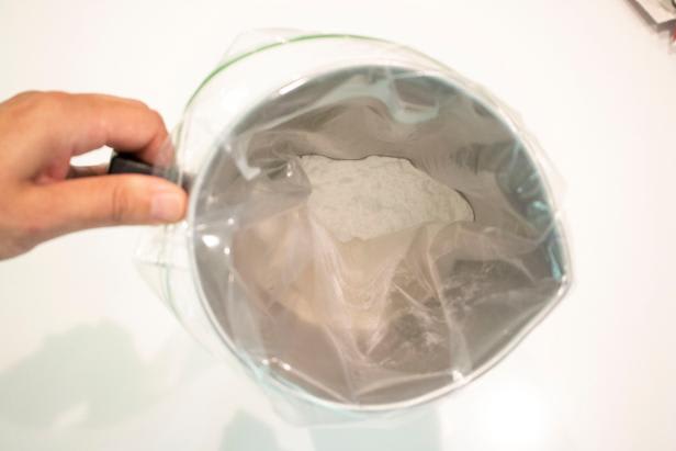 Place the gallon-size plastic bag, open, inside the pitcher, and fold the edges of the bag around the outside of the container. This helps to keep it upright. Add 1/2 cup of baking soda to the bag.