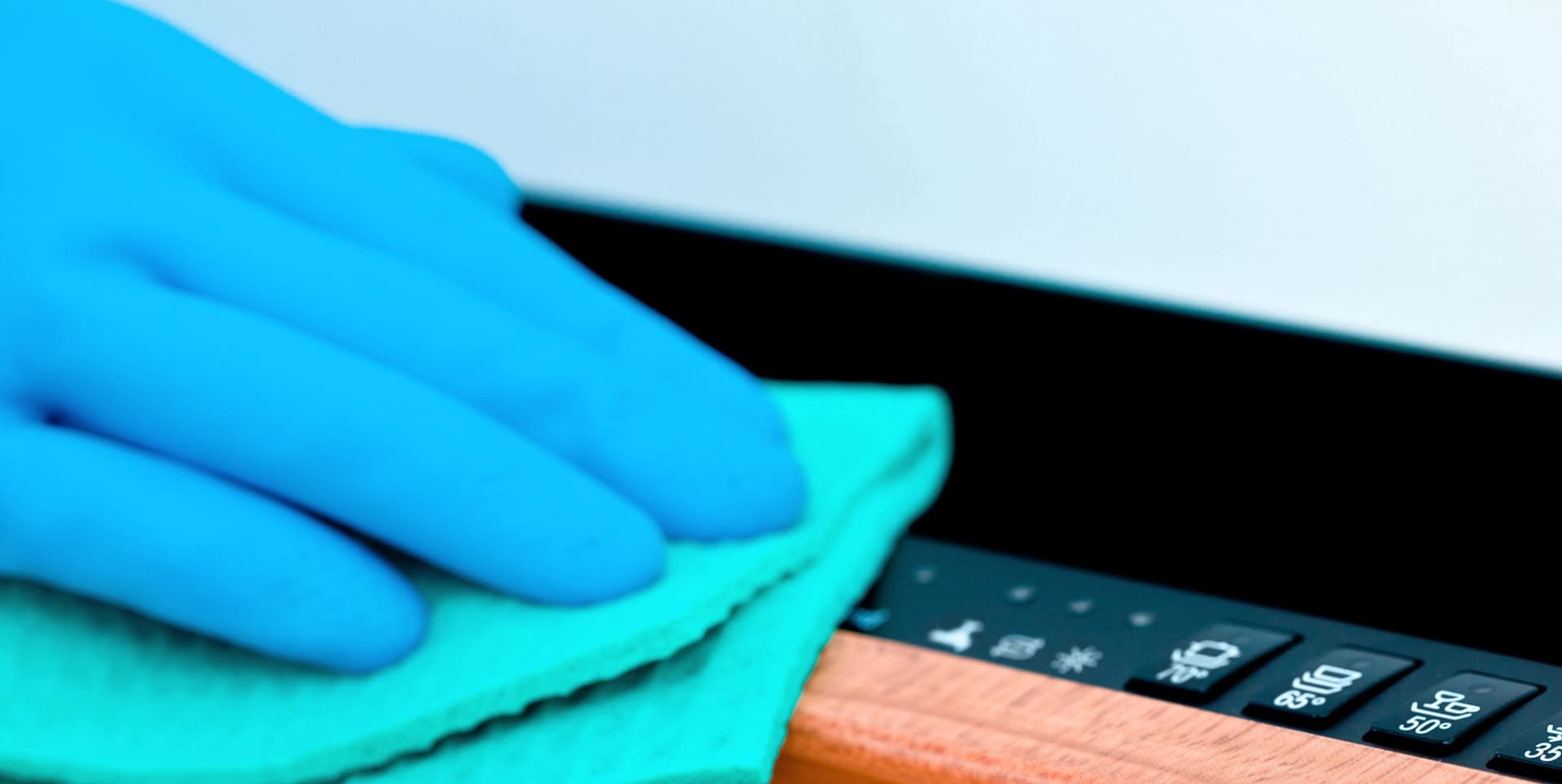 Wipe away any greasy residue and splatters that may have splashed or settled onto the interior surface of the door, the bottom of the dishwasher under the door, the door edges, the handle, and the dishwasher control with a damp microfiber cloth or sponge.