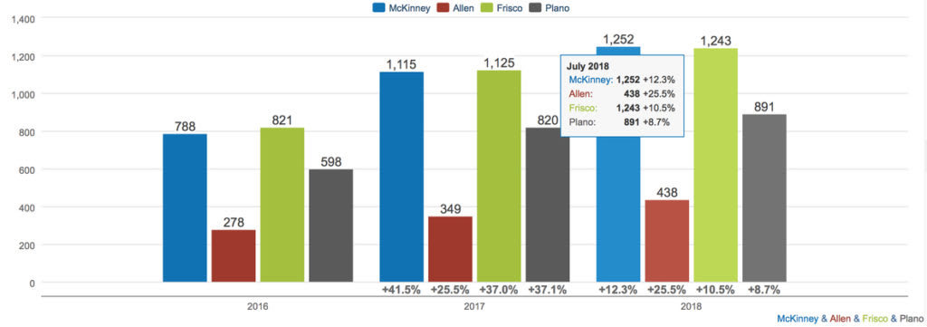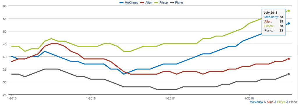 These increases haven’t impacted the luxury home market around Collin County as much except in Allen, where the number of homes priced at $800,000 and higher rose 68 percent over the year July of 2017. Otherwise, McKinney and Frisco were near last year’s figures. Despite the spike in inventory, Allen has not seen a significant increase in days on the market.